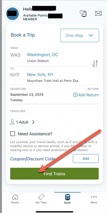 Select your trip, and you will see the Rail Passengers link come up in the “Applicable Discounts” if it is available to use (certain circumstances like weekday Acela or business class it is NOT valid for)