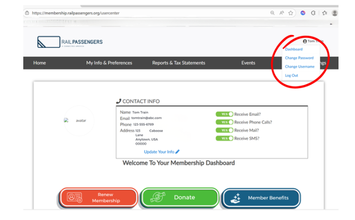 After logging into your account, your name appears in the upper right corner, Tom Train in the screenshot. Click on your name and navigation options including “Change Username” appears. Remember to save any changes you make.