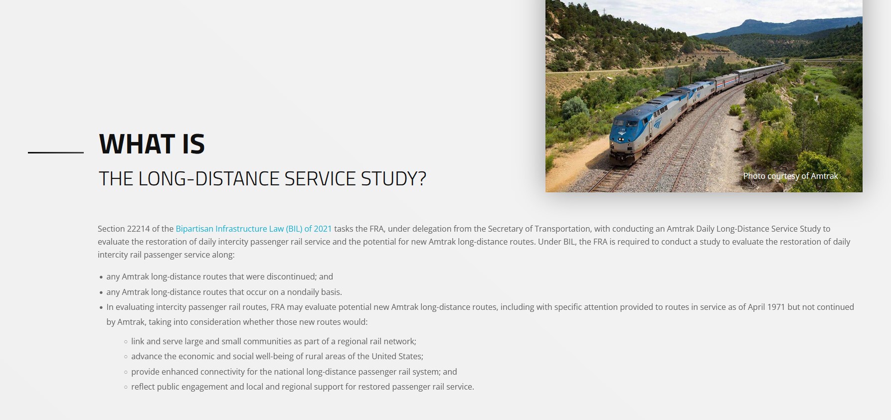 This week, thanks to Section 22214 of the BIL, the Federal Railroad Administration (FRA) launched its official long-distance study website. It gives you the who, what, and why of the process the FRA is about to undertake over the next two-years.