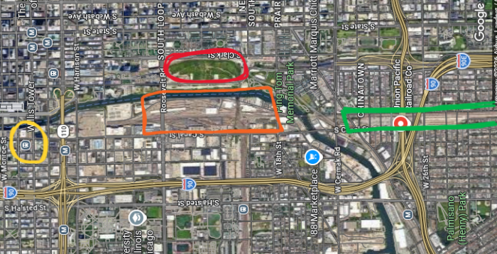 For those who don’t know the area: the yellow circle is Union Station, the orange box is the current Amtrak and BNSF/Metra yards, the red area is the “78” where the Chicago Fire’s new soccer stadium is being built along with a new entertainment district. The green section is UP’s yard.