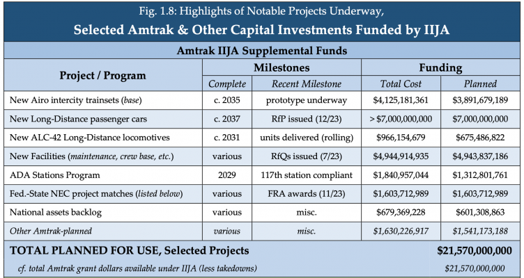- Investment Ramp-Up Coming: The FRA and U.S. Department of Transportation obligated or contingently obligated almost $9.7 billion to Amtrak during Calendar Year 2023, most of which was provided by the IIJA.