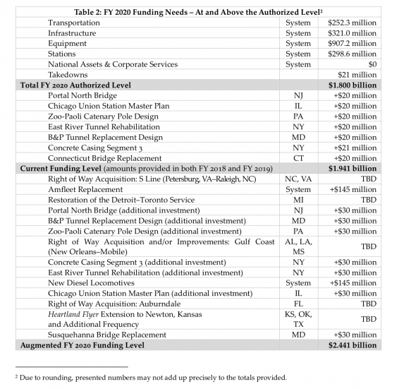 Amtrak’s Fiscal Year 2020 Grant and Legislative Request was published this week. While it makes a total request of $1.8 Billion as authorized by current law, it includes a request for subsequent appropriations for the following four years, officially suggesting a long overdue dedicated funding stream to sustainably support both the Northeast Corridor and National Network. The request also included a substantial list of potential add-ons, should an appropriation exceed $1.8 Billion as it has for the past two years. It is essentially a menu of options for legislators, and by extension, for passengers to ask their legislators for.